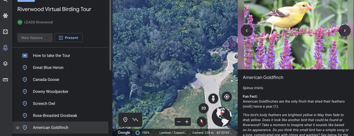 The new Riverwood Virtual Birding Tour guides viewers along the park’s trails to highlight areas where 14 bird species can be found. Each stop on the tour focuses on one species, describing its’ appearance, size, diet, and some fun facts. Pictures, videos, and sonograms (recordings of bird calls) are also included.